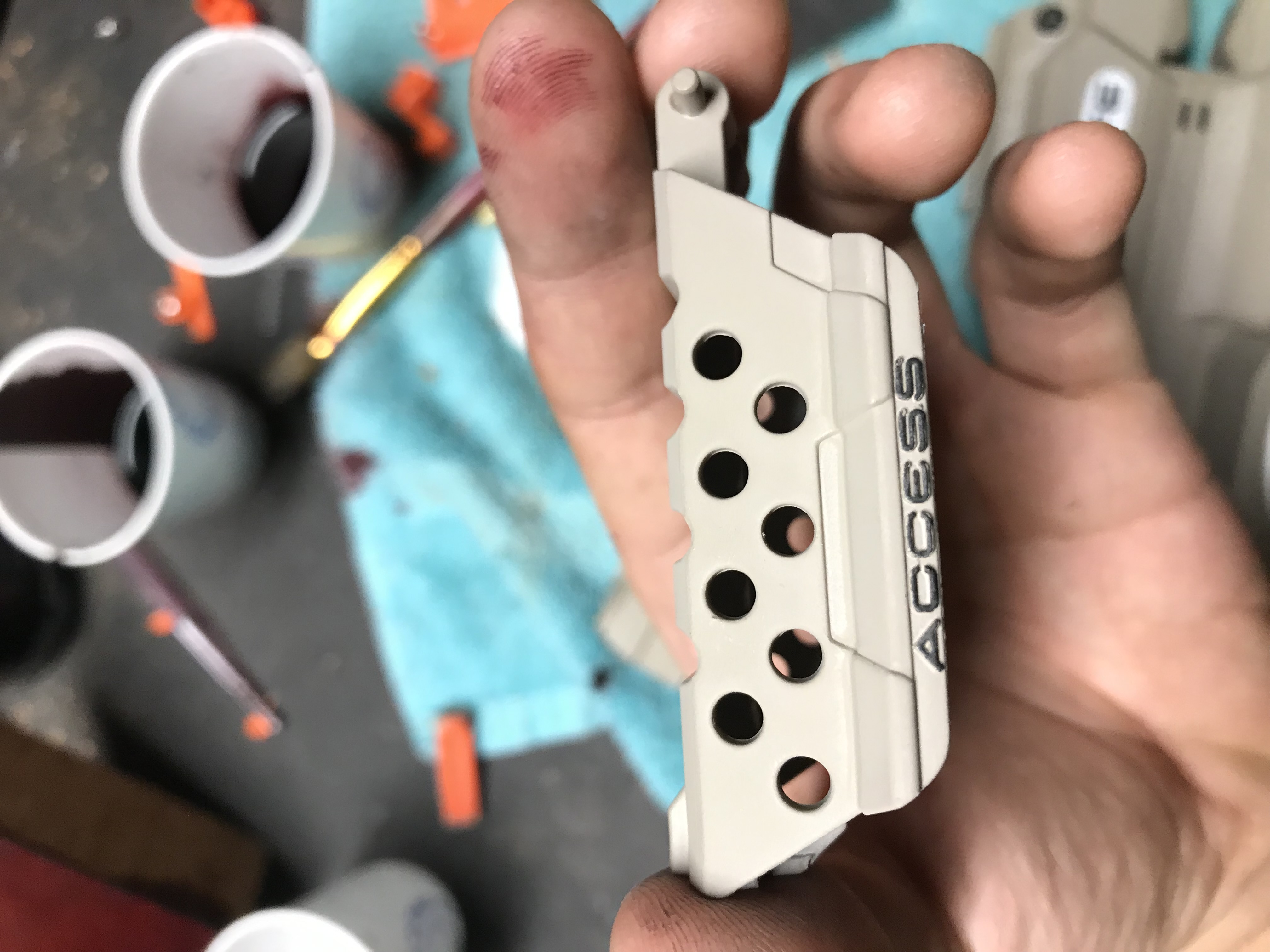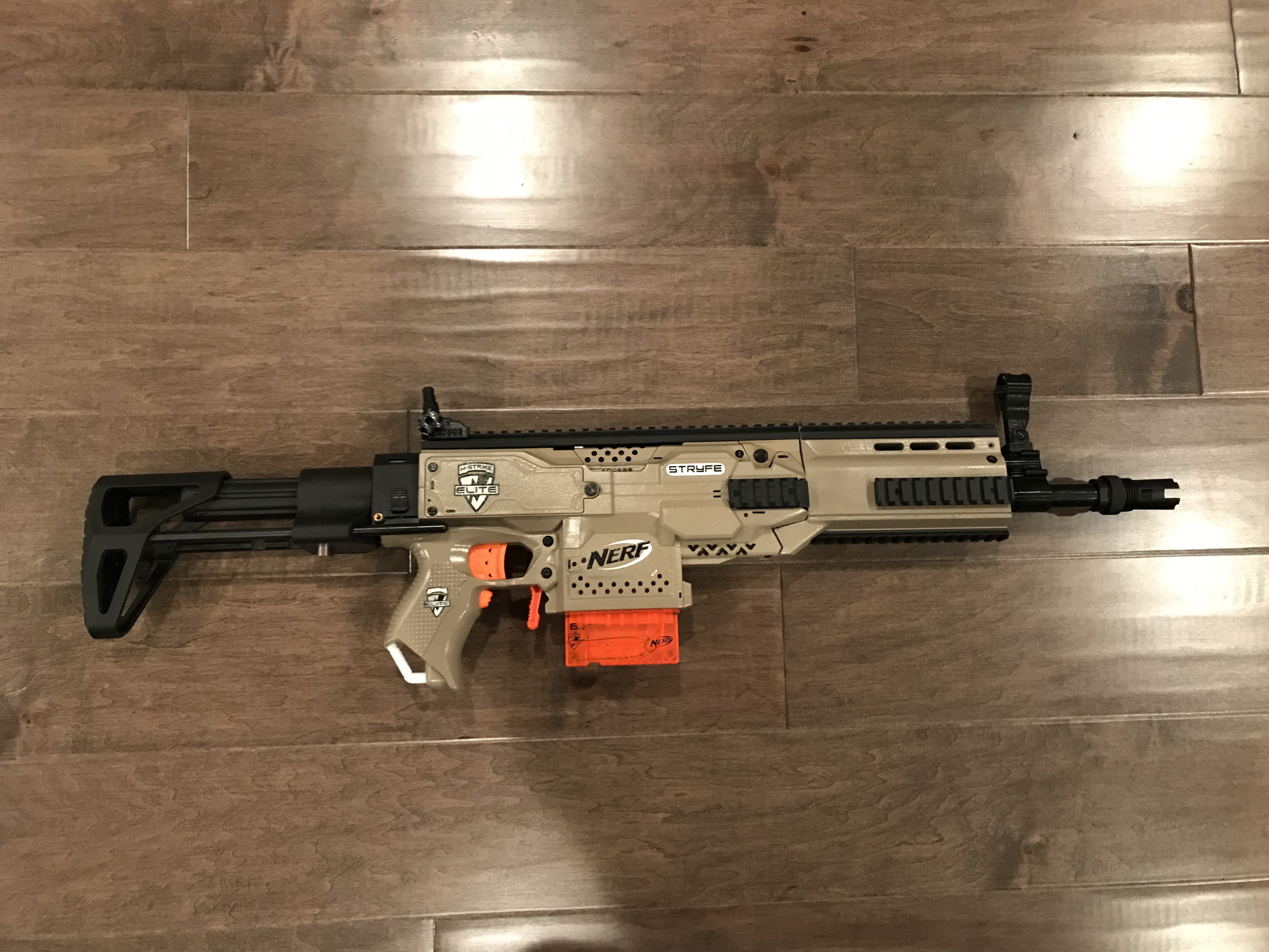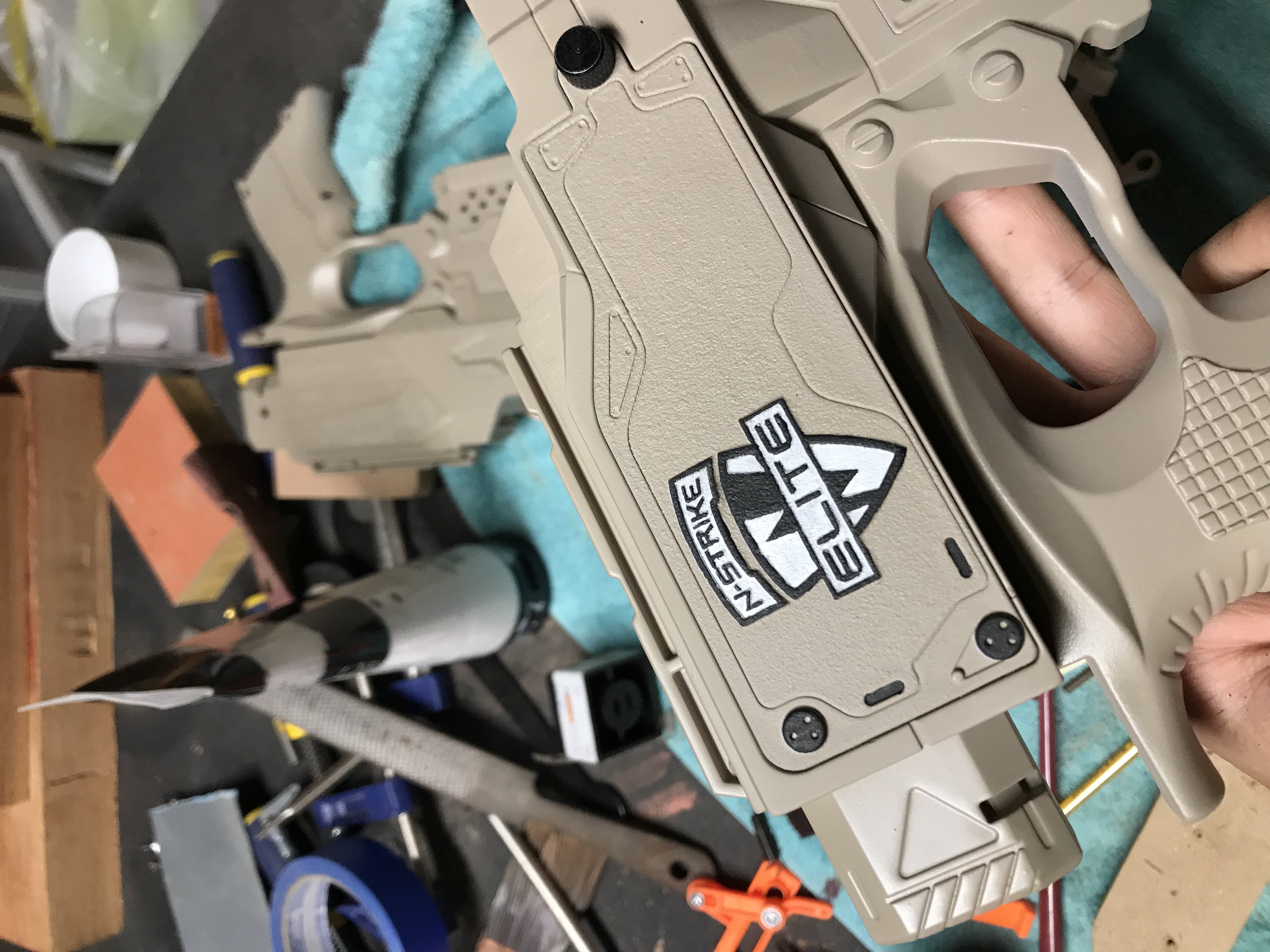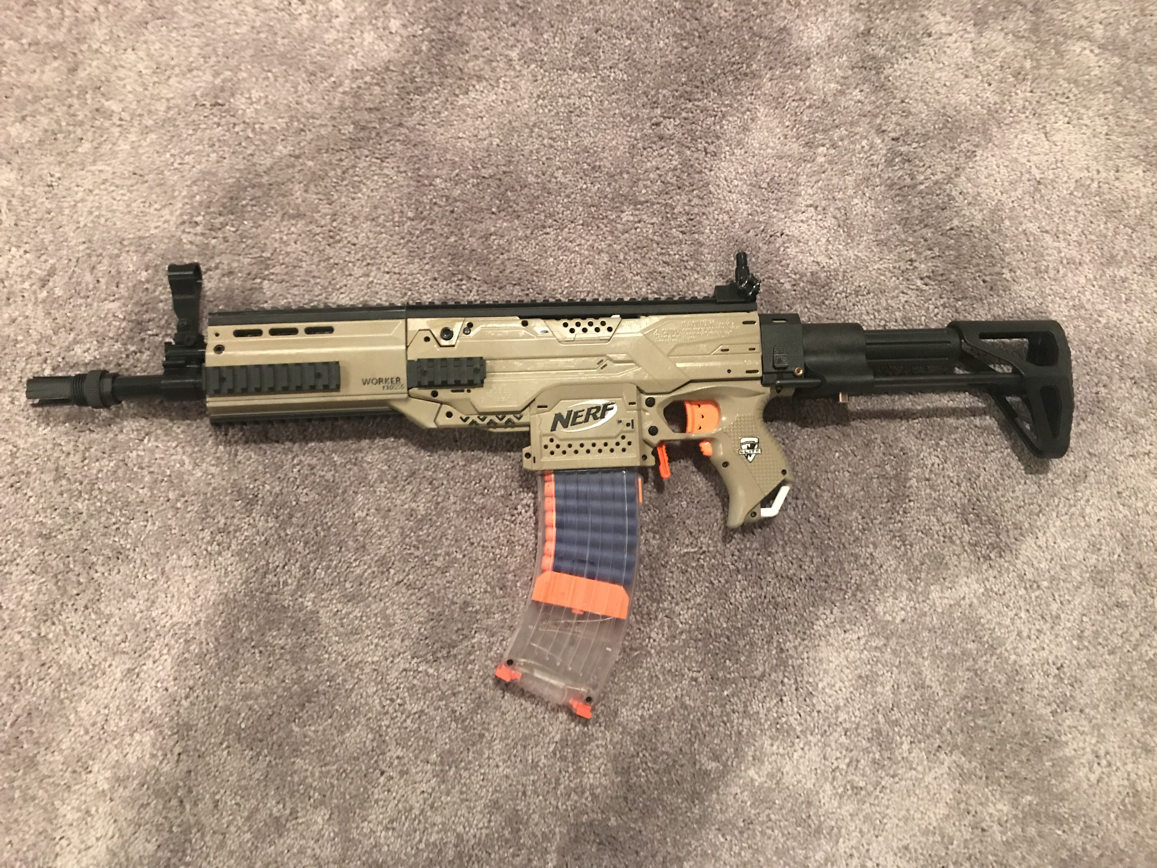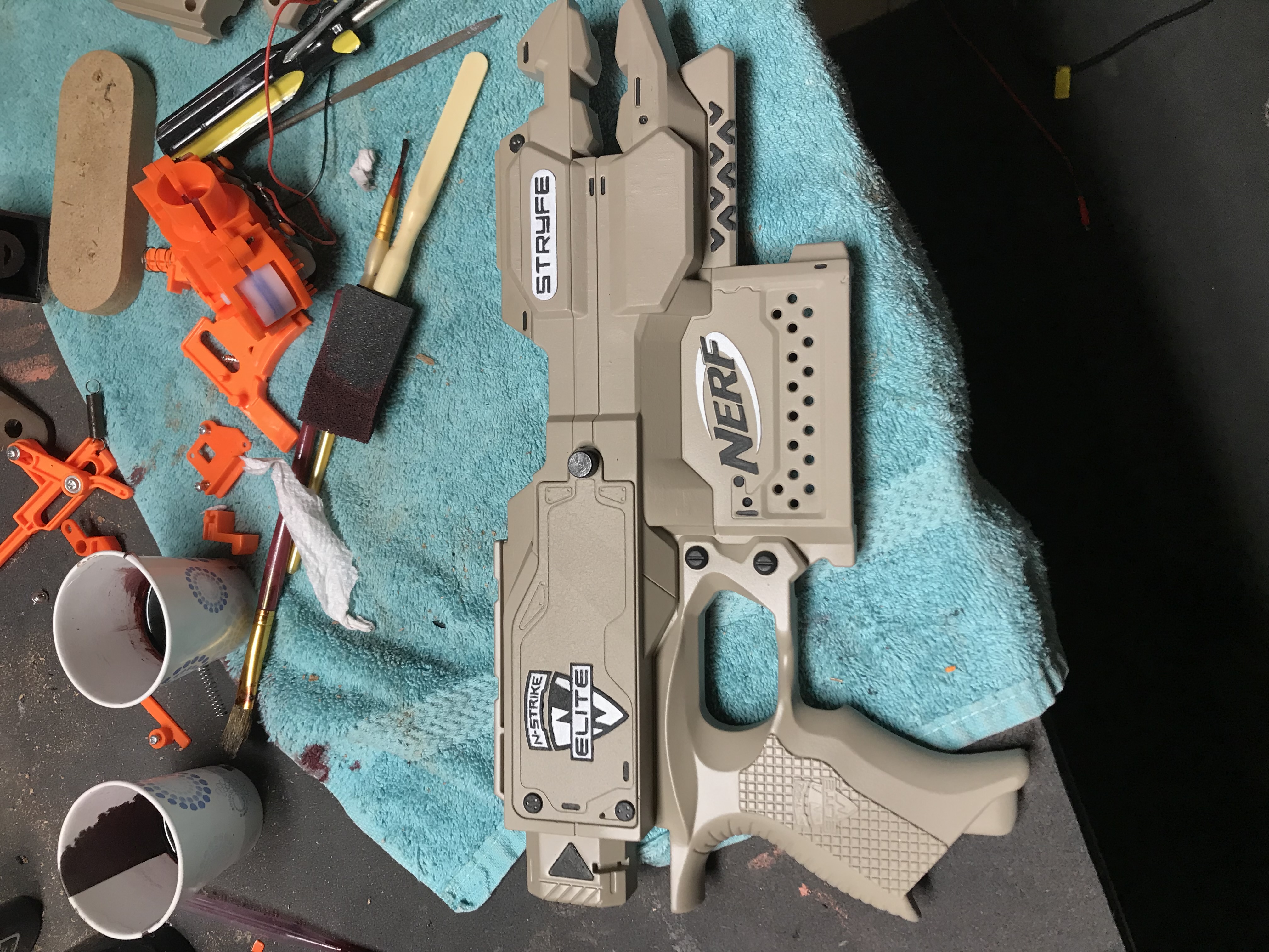This was a fun project that started with a Nerf Stryfe I found on eBay. I started by replacing some of the internals like the flywheels and motors with some stronger aftermarket replacements. I then added a series of molded and 3D printed parts to change the appearance of the blaster. I individually painted each piece before clearcoating the whole thing for some added durability.